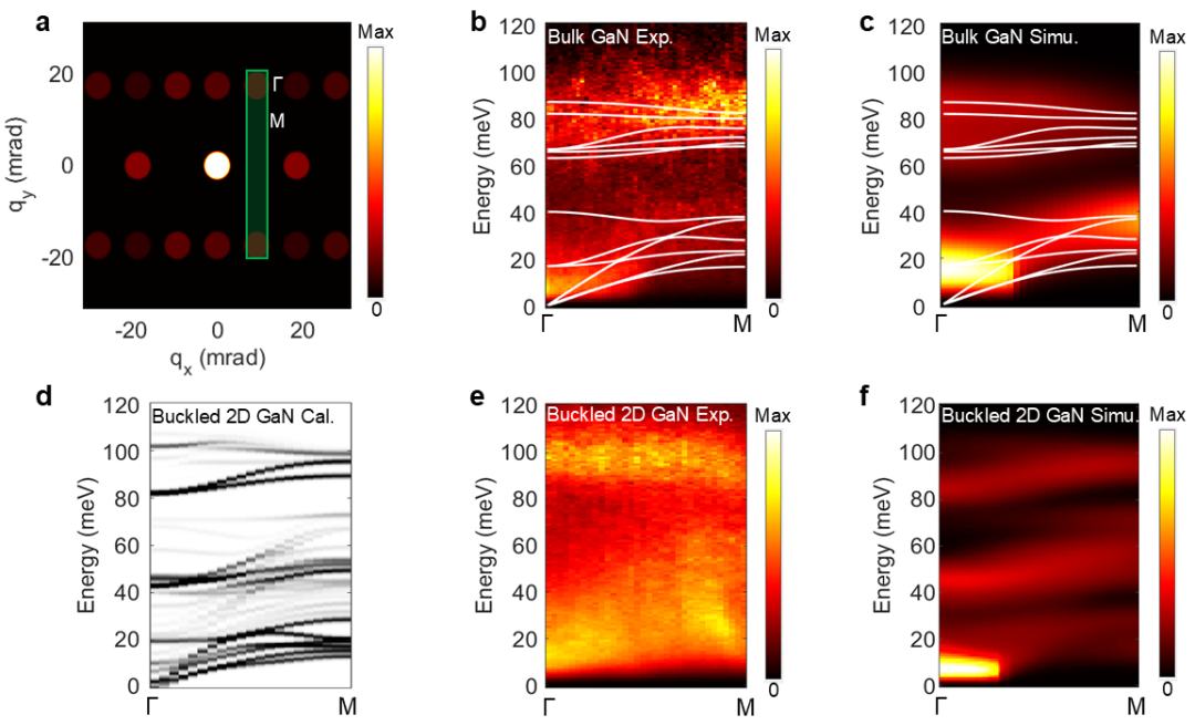 图1.体GaN与褶皱二维GaN的声子色散。(a)EELS光阑在衍射面的摆放示意图。绿色矩形框标示了EELS光阑的位置,旁边标注了选取的动量路径。(b)体GaN的声子色散,白色线为计算的体GaN声子色散曲线。(c)体GaN声子色散的模拟结果,白色线为计算的体GaN声子色散曲线。(d)褶皱二维GaN投影声子色散的计算结果。(e)(f)实验和计算褶皱二维GaN的声子色散。