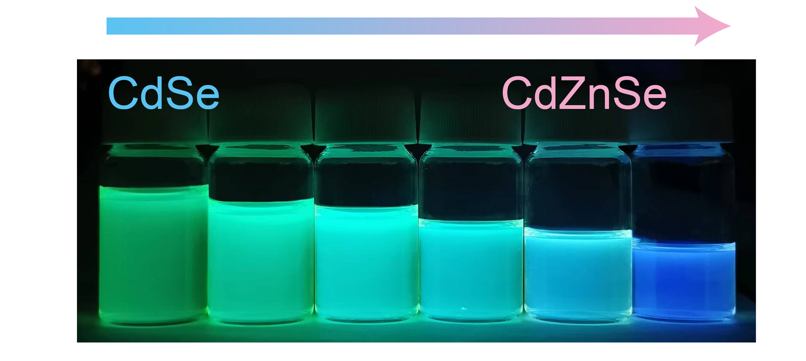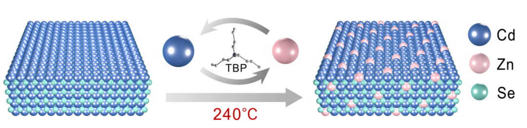 胶体量子阱(CQWs)独特的各向异性特性使其在纳米晶基器件中具有很高的应用前景。然而,基于CQWs的绿色和蓝色发光二极管的有限性能阻碍了它们的实际应用。在本研究中,首次通过直接阳离子交换实现了具有特定尺寸、形状和晶体结构的合金硒锌镉CQWs。这种方法有效使得纳米晶的发光波长蓝移,并能维持量子阱的片状形貌,为后续的溶液外延生长提供种子。