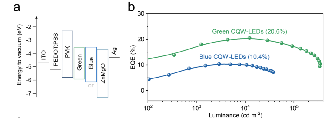 研究团队考虑到异质结构对于纳米晶表面缺陷的钝化作用,通过热注入壳层生长方法在硒锌镉核外侧外延生长硫化锌保护层。这种方法有效地提升了纳米晶的发光效率与提纯稳定性,为后续的器件制备提供了优良的发光材料。值得一提的是,该策略有效解决了长期困扰胶体量子阱领域有关发光波长过度红移的问题,在蓝光区与绿光区均实现了优秀的发光性能。