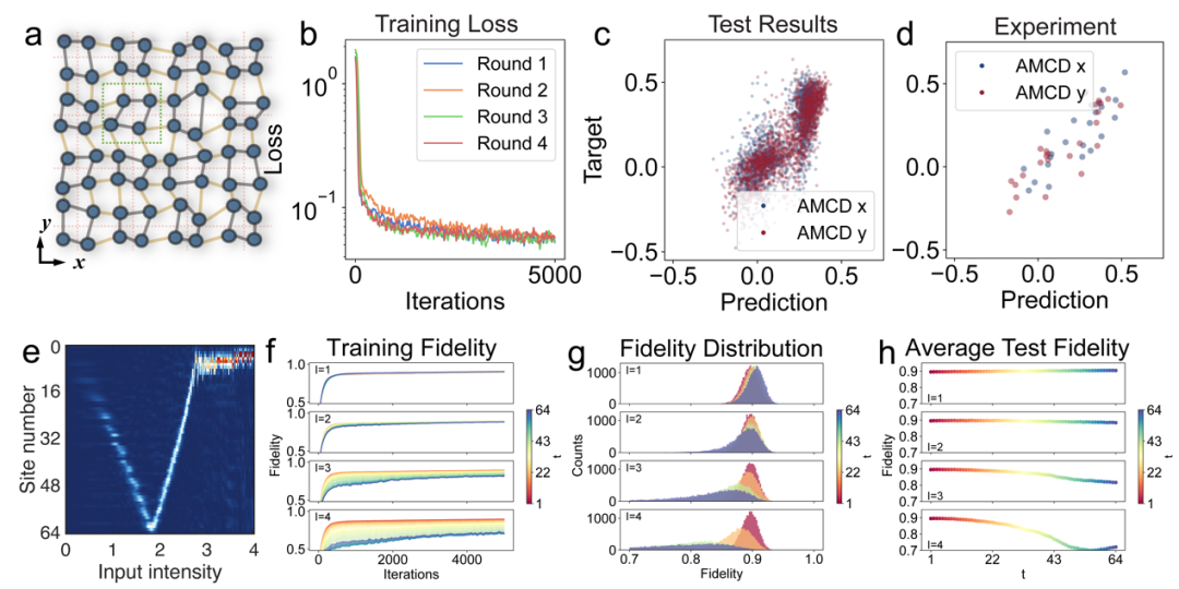 图2. 光子神经网络用于计算二维无序拓扑模型的拓扑不变量和模拟非线性拓扑系统的演化。(a) 二维无序SSH模型示意图;(b) 网络四个不同初始化的训练损失曲线;(c) 网络的第一轮训练的测试集结果;(d) 从测试数据集中随机取出的24个样本的实验测量结果;(e) 给被非线性调制的系统施加边界输入,在时间T=64时波函数的分布;(f) 模拟64个不同时间步长上的训练保真度曲线;(g) 测试集上的保真度分布;(h) 测试集上所有时间步长的平均保真度分布。