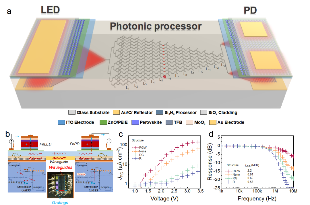 图1. 单片异质集成的钙钛矿/氮化硅光子芯片系统。(a) 异质集成片上钙钛矿/氮化硅光子芯片系统的结构示意图;(b) 单片集成的钙钛矿发光二极管、光电探测器和氮化硅波导网络的工作原理示意图,插图展示了拍摄的单片集成芯片光子系统照片;(c) 不同结构的光电流-驱动电压曲线;(d) 不同结构的系统频率响应。