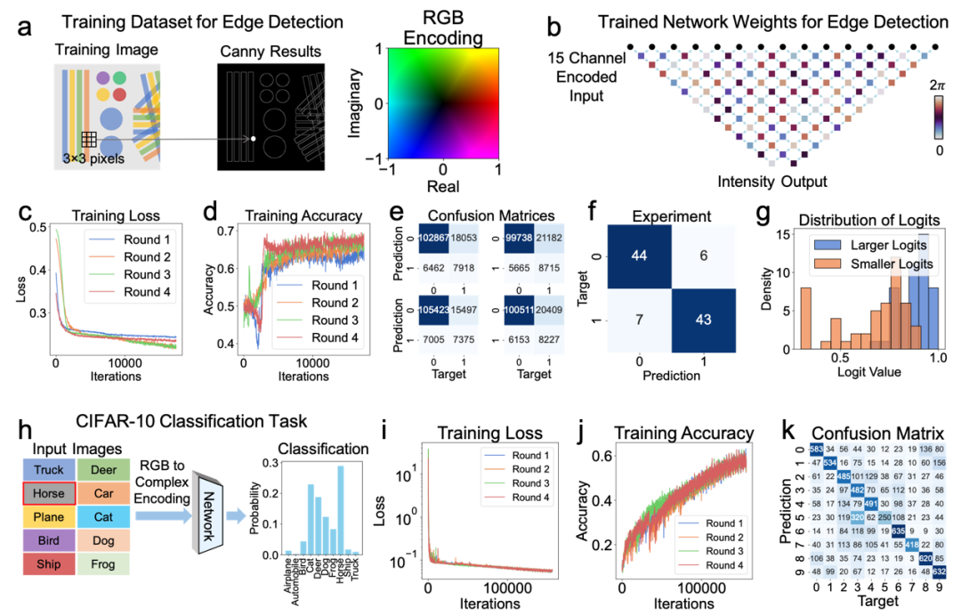 图3. 光子神经网络用于图像边界检测和图像分类任务。(a) 将3×3图像块编码为复振幅,色相表示相位,亮度表示强度,目标来自Canny数据边界检测;(b) 网络构型及第一轮训练中的权重分布;(c) 边界检测的训练损失函数曲线;(d) 边界检测的训练准确率曲线;(e) 边界检测的测试集混淆矩阵;(f) 实验测得的边界检测混淆矩阵;(g) 实验测得的边界/非边界分类的输出分布。(h) CIFAR-10图像分类任务;(i) CIFAR-10分类的训练损失曲线;(j) CIFAR-10分类的训练准确率曲线;(k) CIFAR-10测试集上的混淆矩阵。