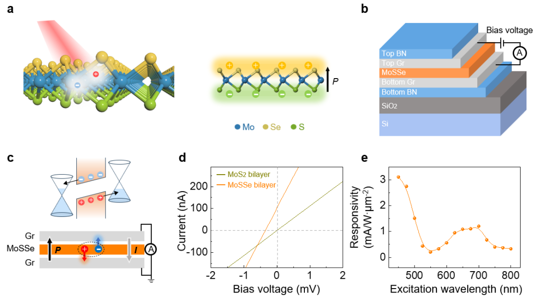 图1. a-b, Janus MoSSe单层结构及自发光伏器件示意图。c, 器件能带和光生载流子转移过程示意图。光电流方向与极化方向相反。d, MoSSe双层和MoS2双层光电器件的响应对比。e, 光电流响应随激发波长的变化。