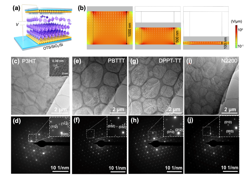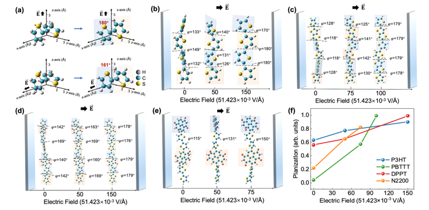首先,研究团队利用第一性原理计算,以典型共轭聚合物P3HT为例,模拟在基底自组装诱导和取向电场极化诱导双重限域条件下,P3HT分子链克服扭转势能形成平面链结构的动力学过程(图1a-b);进一步仿真结果表明,这种双重限域诱导对于分子结构更加复杂的PBTTT、DPPT-TT和N2000同样有效,具有广泛的通用性(图1c-f)。