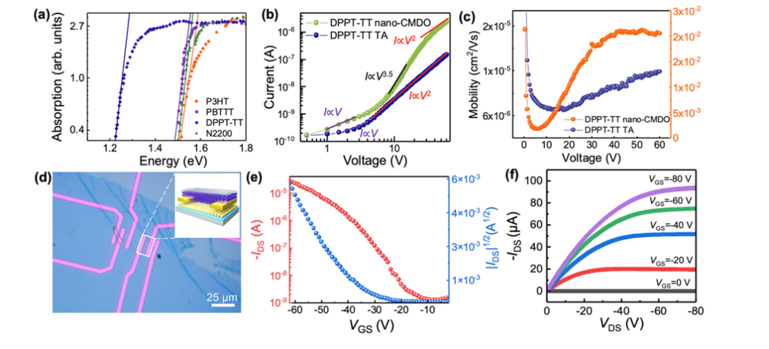 在此基础上,研究团队研究了nano-CMDO制备的共轭聚合物单晶薄膜的电学特性(图3)。光热偏转光谱结果表明,所有共轭聚合物单晶薄膜的Urbach能量均为当前文献报道的最低值,其中N2200单晶薄膜的Urbach能量低至25 meV;此外,共轭聚合物单晶薄膜SCLC器件表现出接近理想状态的电荷输运行为;最后,通过优化有机半导体薄膜场效应晶体管制备工艺,DPPT-TT单晶薄膜的晶体管迁移率达到15.5 cm2V-1s-1,为其在高性能有机电子器件方面的应用奠定了坚实基础。