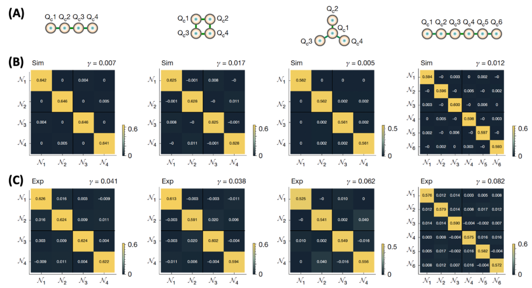 连续变量簇态具有严格的定义,其成功制备需要经过严格实验验证。由于van Loock-Furusawa判据主要侧重于对nullifier的压缩进行分析,随着从双模纠缠到多模纠缠的转变,量子纠缠的结构复杂性发生了重大变化,仅仅依赖该判据无法全面解析所制备簇态的全部纠缠信息。为了严格证明并确定连续变量纠缠簇态的成功制备,尤其是在非线性过程复杂的集成微梳量子纠缠系统中,团队进一步对nullifier的噪声关联矩阵进行了全面的测量与分析。在早期实验中,团队仅通过线性操控量子光场的数据分析发现,nullifier之间存在显著的额外非对角噪声关联。这表明量子光场的纠缠信息并未完全包含在nullifier内,与簇态纠缠的对角噪声关联结构不符。通过对簇态制备过程对应代数结构的深入分析,团队提出了一种创新方法:通过同时精确调控泵浦条件(包括功率和失谐量)以及量子光场的线性操控,成功消除了簇态纠缠制备过程中nullifier的额外非对角噪声关联。最终,团队显著降低了不同簇态纠缠nullifier之间的非对角噪声关联(见图3B:理论模拟,图3C:实验结果)。这一成果不仅严格证明了连续变量簇态的成功制备,还实现了对不同簇态纠缠结构的精确测量,为复杂量子纠缠态的制备与验证提供了新的方法论。