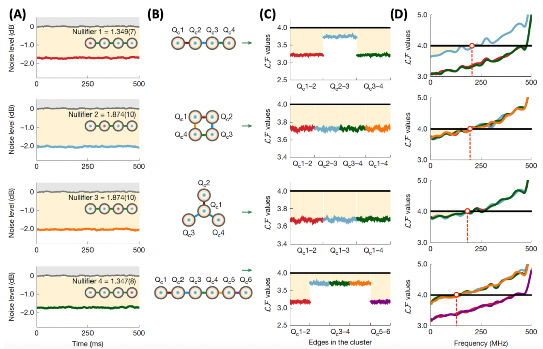 图2. 不同纠缠结构的连续变量簇态实验结果:(A)Nullifier;(B) 不同纠缠结构簇态;(C)van Loock-Furusawa判据实验结果;(D)100MHz宽带纠缠判定。