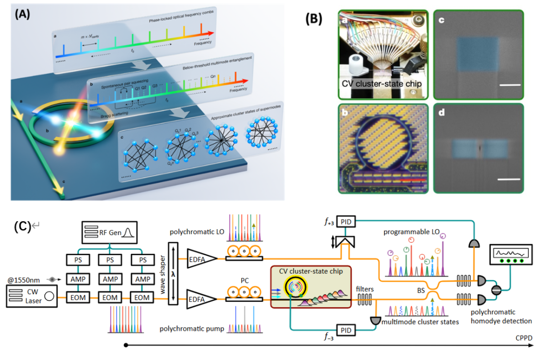 纠缠簇态作为一种典型的多比特量子纠缠态,在量子信息科学中具有极其重要的地位。簇态不仅是单向量子计算的核心资源,还在量子纠错和容错量子计算中发挥关键作用,同时为量子网络的构建提供了重要支持,并可用于模拟复杂的多体量子系统。尽管簇态纠缠的重要性已被广泛认可,但其大规模制备技术仍面临诸多挑战。此前,光量子芯片上的簇态纠缠研究主要集中在离散变量体系,确定性地制备大规模纠缠簇态面临巨大实验困难,而连续变量簇态的片上制备和验证技术在国际上仍属空白。