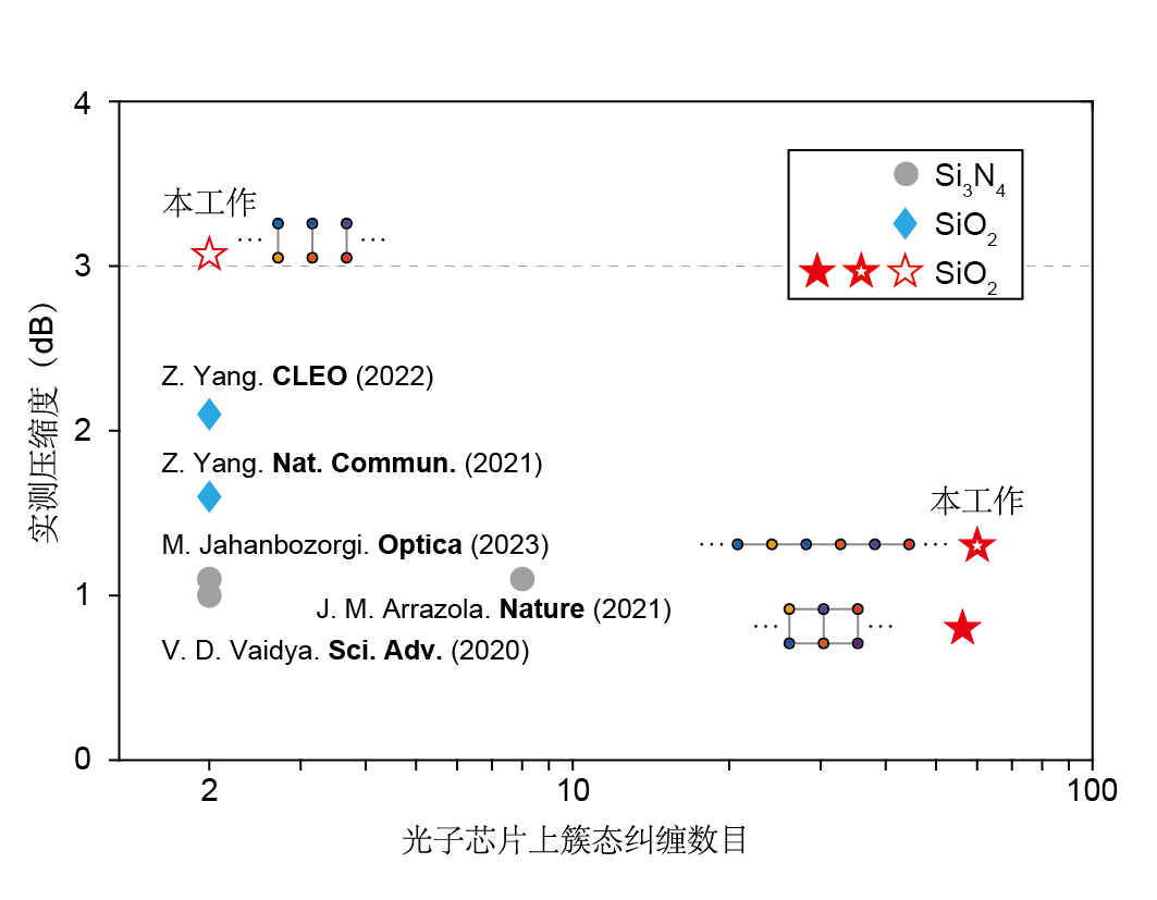 图2:目前在芯片上产生的连续变量量子态的规模和压缩度