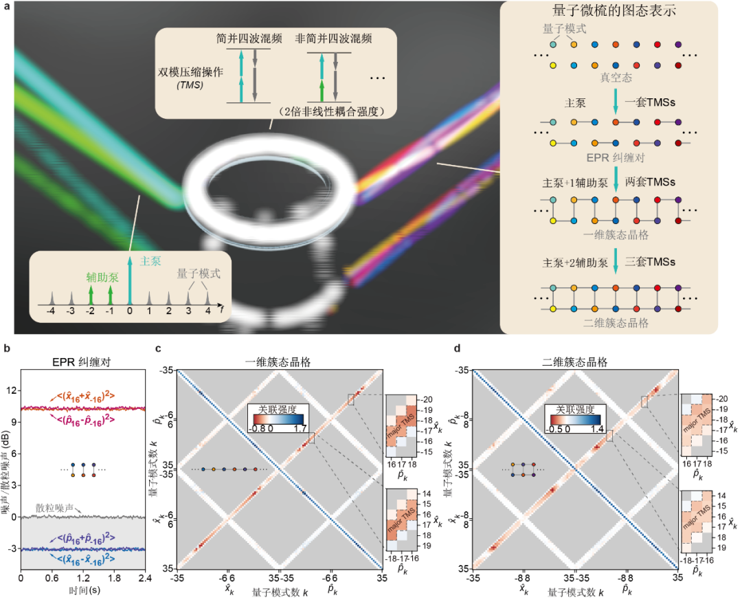 图1:(a)构造簇态量子微梳的基本原理。(b)EPR对正交分量的噪声。灰线:散粒噪声。(c)一维簇态的协方差矩阵。(d)二维簇态的协方差矩阵。