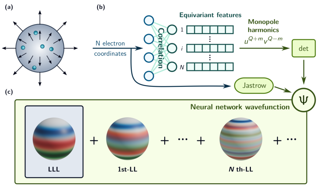图1. (a) 球面几何系统,电子被限制在球面上,球心放置一个磁单极子 (b) DeepHall 框架示意图 (c) 朗道能级混合示意图