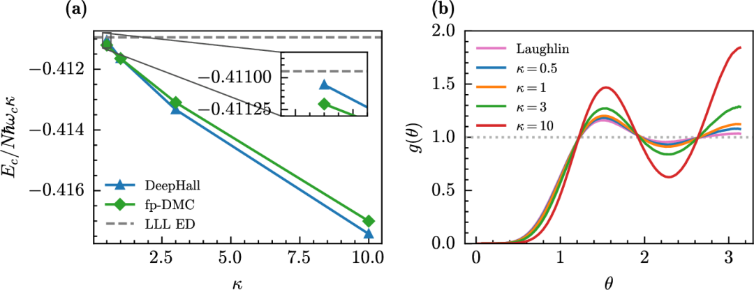 图2. (a) 不同朗道能级混合参数 κ 下,DeepHall 和 fp-DMC 得到的单个电子的能量对比。直接对角化的能量结果与 κ 无关,用虚线表示 (b) 不同 κ 下的对关联函数。计算基于 1/3 填充、包含 6 个电子的系统。