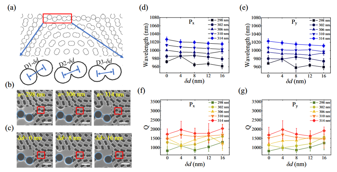 图2. 不同晶格常数、原胞最外层空气孔位移量的莫尔超晶格结构和基模特性。(a), 莫尔腔结构最外层的示意图。(b), 不同晶格常数下莫尔腔结构最外层的SEM放大图。(c), 不同位移量下莫尔腔结构最外层的SEM放大图。(d, e), 不同晶格常数、位移量的莫尔腔基模Px,Py的平均波长。(f, g), 不同晶格常数、位移量的莫尔腔基模Px,Py的平均品质因子。