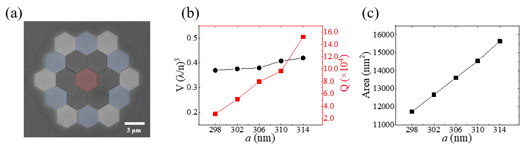 图1. 莫尔超晶格结构及其莫尔腔基模Px的优化。(a), 莫尔超晶格结构SEM图。(b), 固定空气孔半径为72 nm,不同晶格常数下基模Px的品质因子和模式体积。 (c), 不同晶格常数下基模Px的有效面积。