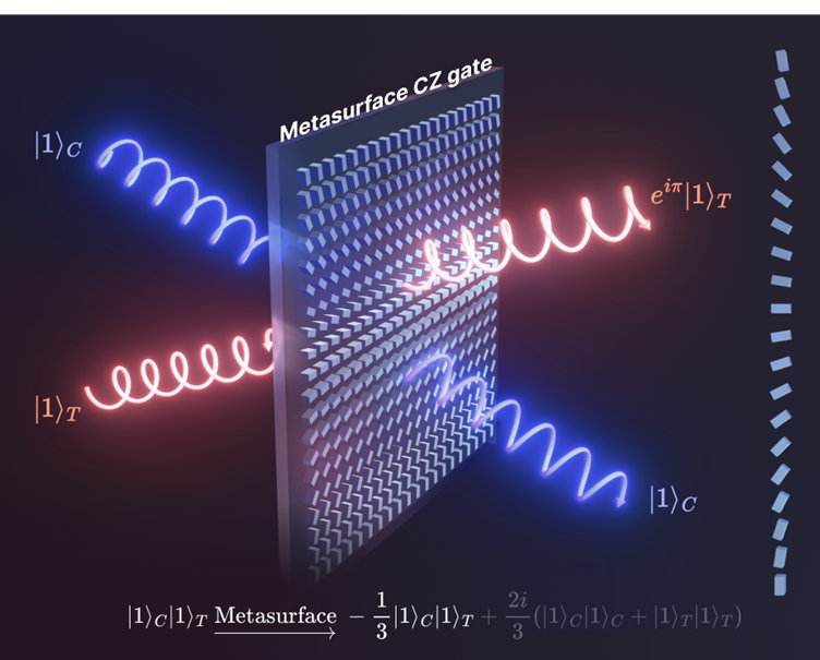 集成光量子计算作为量子信息科学的重要分支,其核心挑战之一在于实现高保真度的片上两比特量子逻辑门(如受控相位门,即CZ门)。传统方案通常依赖体积庞大的光学元件或复杂的光波导结构,在器件尺寸、扩展性和效率等方面存在一些局限性,限制了量子器件集成密度的提升。近年来,超构表面技术因其独特的亚波长尺度光场调控能力和优异的芯片兼容性,为解决这一难题提供了创新思路。尽管近些年来超构表面在量子光场操控方面取得了相关进展,然而,如何利用超构表面实现高保真度的两比特量子逻辑门操作,仍是当前亟待突破的关键科学问题。