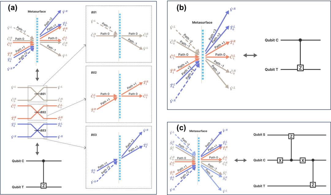 图2 利用超构表面的并行分束能力构建量子CZ门。(a) 构建偏振编码CZ门的原理;(b) 路径编码的量子CZ门;(c) 共享控制比特的级联量子CZ门。