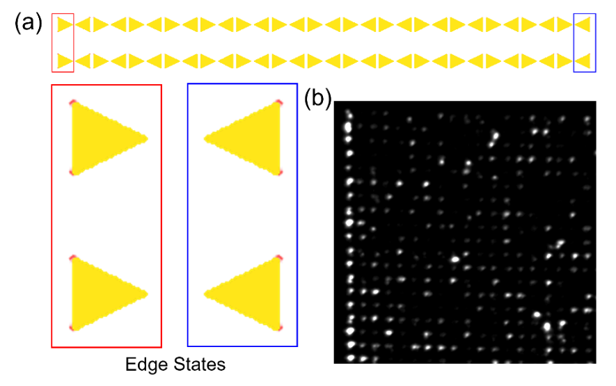 图2 等离激元超表面的边缘态。(a)由于具备拓扑光子带隙,FDTD模拟结果显示该等离激元超表面具有边缘态。(b)光发射电子显微镜(PEEM)观测到的边缘态。