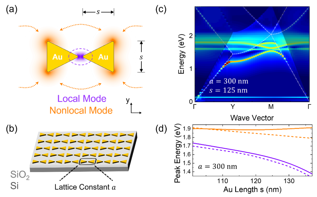 图1 等离激元超表面的拓扑带隙和鲁棒共振能量。(a)等离激元纳腔的局域和非局域模式。(b)等离激元超表面结构,a是晶格常数。(c)小晶格常数超表面的能带。由于光子晶体能带和等离激元模式发生了强耦合,导致拓扑光子带隙被打开,出现反交叉现象。(d)等离激元模式的共振能量随结构参数的变化。与单个等离激元纳腔(虚线)相比,超表面的非局域模式(橙色实线)具有鲁棒的共振能量。