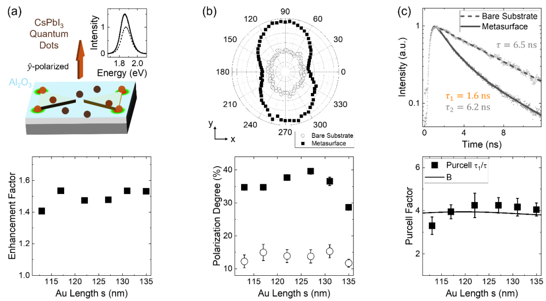 图3 等离激元超表面对CsPbI3量子点的鲁棒增益。(a)超表面-量子点耦合器件的示意图,荧光光谱(实线为超表面结果,虚线为衬底结果)以及荧光强度增益随结构大小参数的变化。(b)角分辨光谱(实心点为超表面结果,空心点为衬底结果)以及偏振度随结构参数的变化。(c)时间分辨光谱(实线为超表面结果,虚线为衬底结果)以及Purcell增益系数随结构参数的变化。可以看到荧光强度、偏振度和辐射速率的增益均具备鲁棒性。