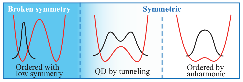 量子无序是长程序被量子涨落压制的现象。典型的例子是横场伊辛、海森堡模型,以及量子自旋液体等自旋和电子系统。对于一个周期性的多体系统,格点间相互作用往往倾向于使系统长程有序(如磁有序),而量子涨落则倾向于使每个格点上局域地无序,两者的竞争体现为量子的有序无序相变。在量子无序相,比如关注比较多的自旋液体态,可能潜在很多新奇的量子物性和特殊的激发,于是在磁性体系中掀起了探寻的热潮。对于原子核自由度,当晶格具有软模声子时(图一),每个格点上可能的原子核隧穿也可以提供强的量子涨落。有隧穿参与的晶格运动极有可能具有新奇的声子-“声子”散射和电“声”耦合。那么,晶格自由度能否进入量子无序相,以及如何描述此时的晶格运动,就成为了一个人们尚未关注、但具有一定基础研究意义的新问题。