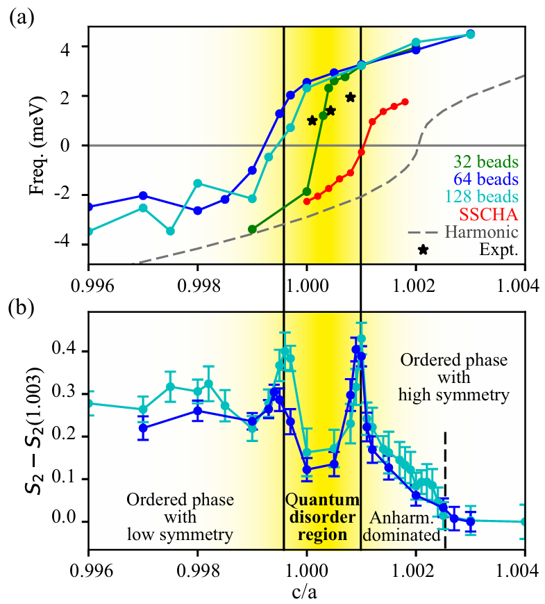 传统的基于声子的理论方法对于软模,主要通过三声子、四声子项等微扰处理来考虑非谐效应和有限温情形,难以规避丢失部分量子多体关联的风险。隧穿的加入,则使得晶格运动更加复杂,此时传统声子理论可能不再适用。此外,非谐效应可以一定程度上缓解软模带来的结构不稳定性(图一),从而挤占量子无序相的存在空间。所以,不管是抓住多体效应,还是确定量子无序相的区域,都在原子尺度上对理论计算方法提出了更高的要求。