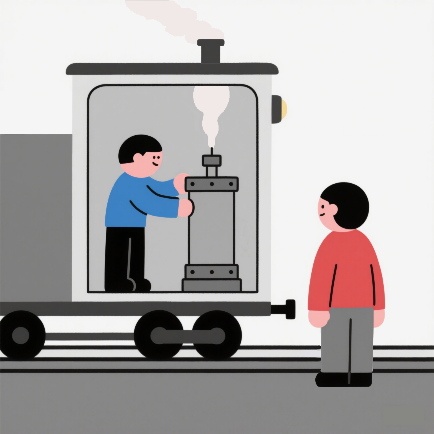 图1. 火车相对于地面做匀速直线运动。对于火车车厢内的一个热力学实验——压缩气缸里的气体做功,静止在地面的观测者和静止在火车车厢内的观测者测得的做功量不同,但是两位观测者发现他们各自测得的做功量满足的热力学规律——协变形式的涨落定理——是一样的。