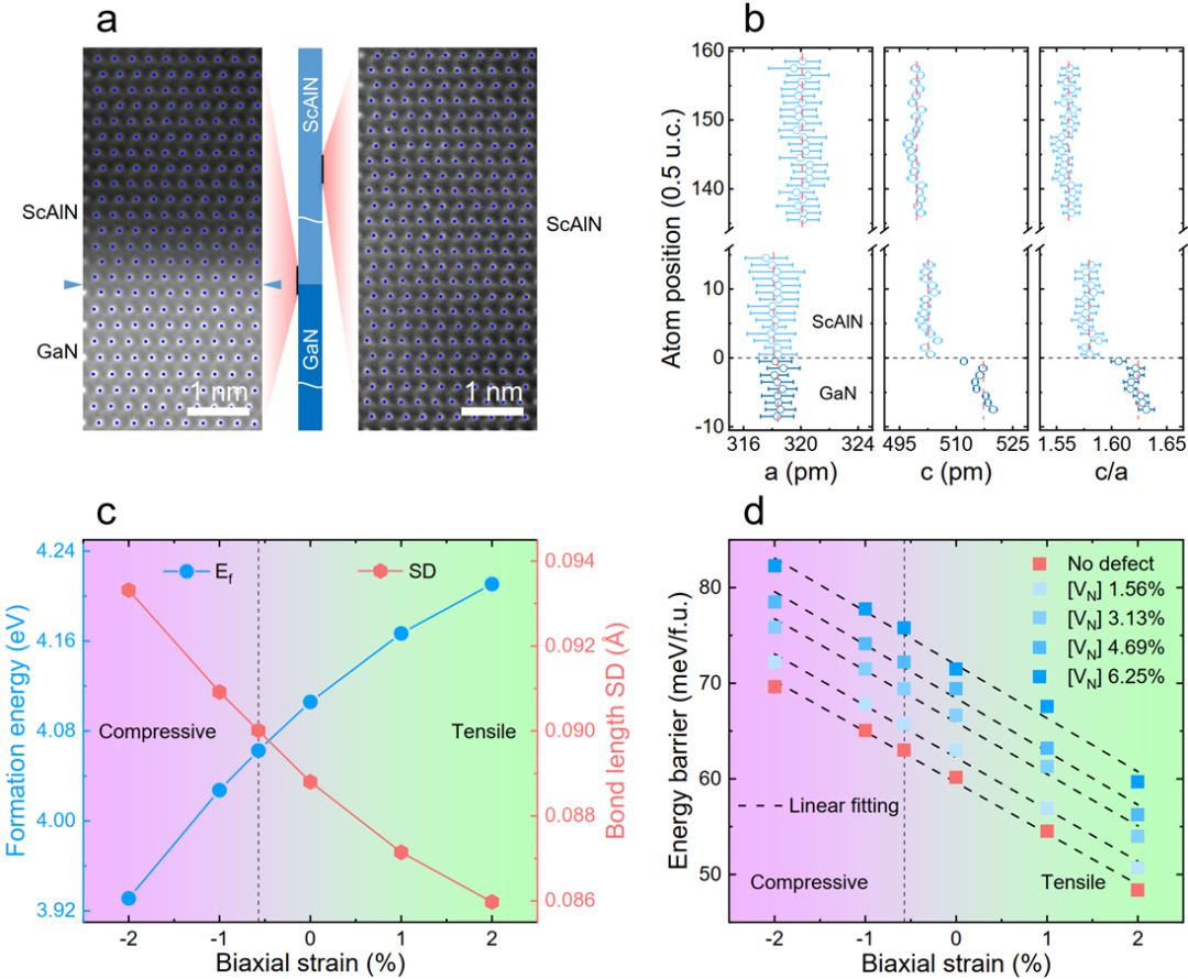 图5. 铁电ScAlN中应变、氮空位和极化翻转势垒之间的联系。