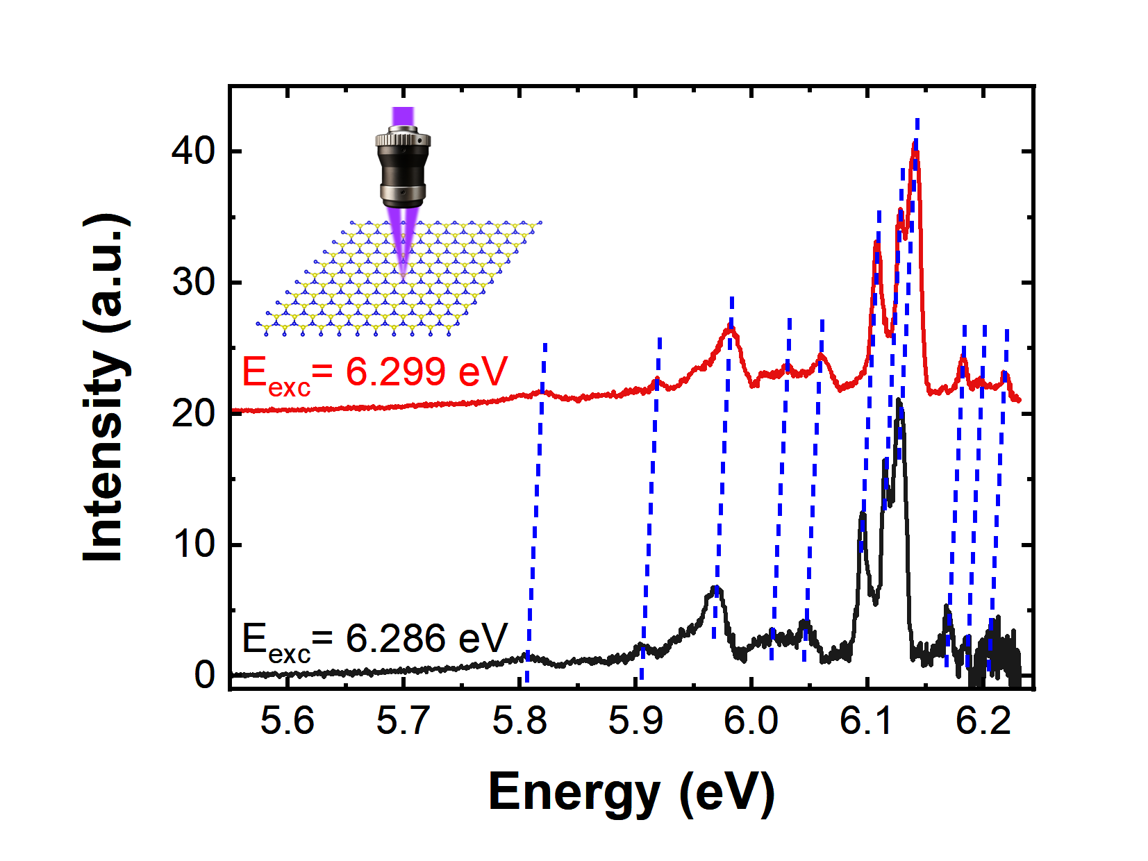 图1. 单层BN在紫外近共振激发下的光谱。谱峰随激发能量而全局移动,证明信号为共振拉曼而非光致发光。