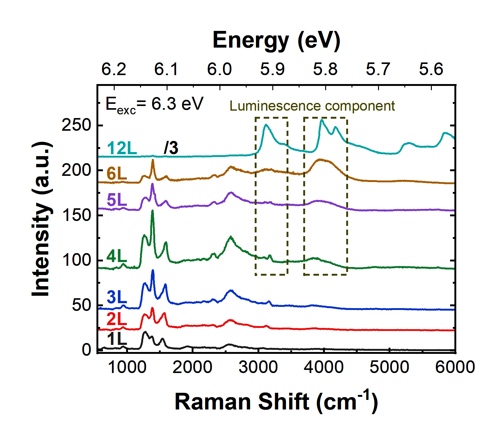 图2. 1~12层h-BN在深紫外共振激发下的光谱演变。1~3层仅有共振拉曼信号;光致发光信号从4层开始出现,并随层数增加而增强。